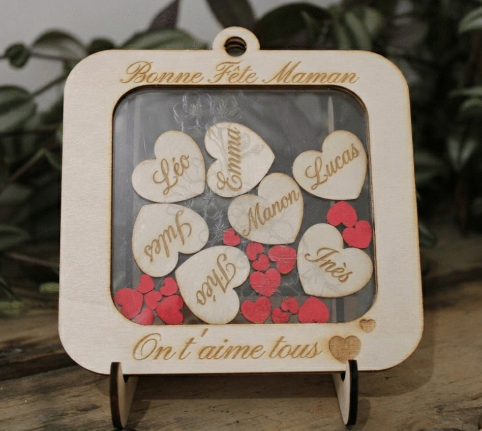 Offrez un cadeau qui vient du cœur avec ce magnifique cadre en bois à personnaliser, conçu spécialement pour célébrer les mamans. Plus qu’un simple objet de décoration, c’est un symbole fort de l’amour qui unit votre famille. Chaque visuel est dessiné, découpé au laser et assemblé à la main dans notre atelier en Ardèche pour un rendu en relief et une personnalisation sur mesure.