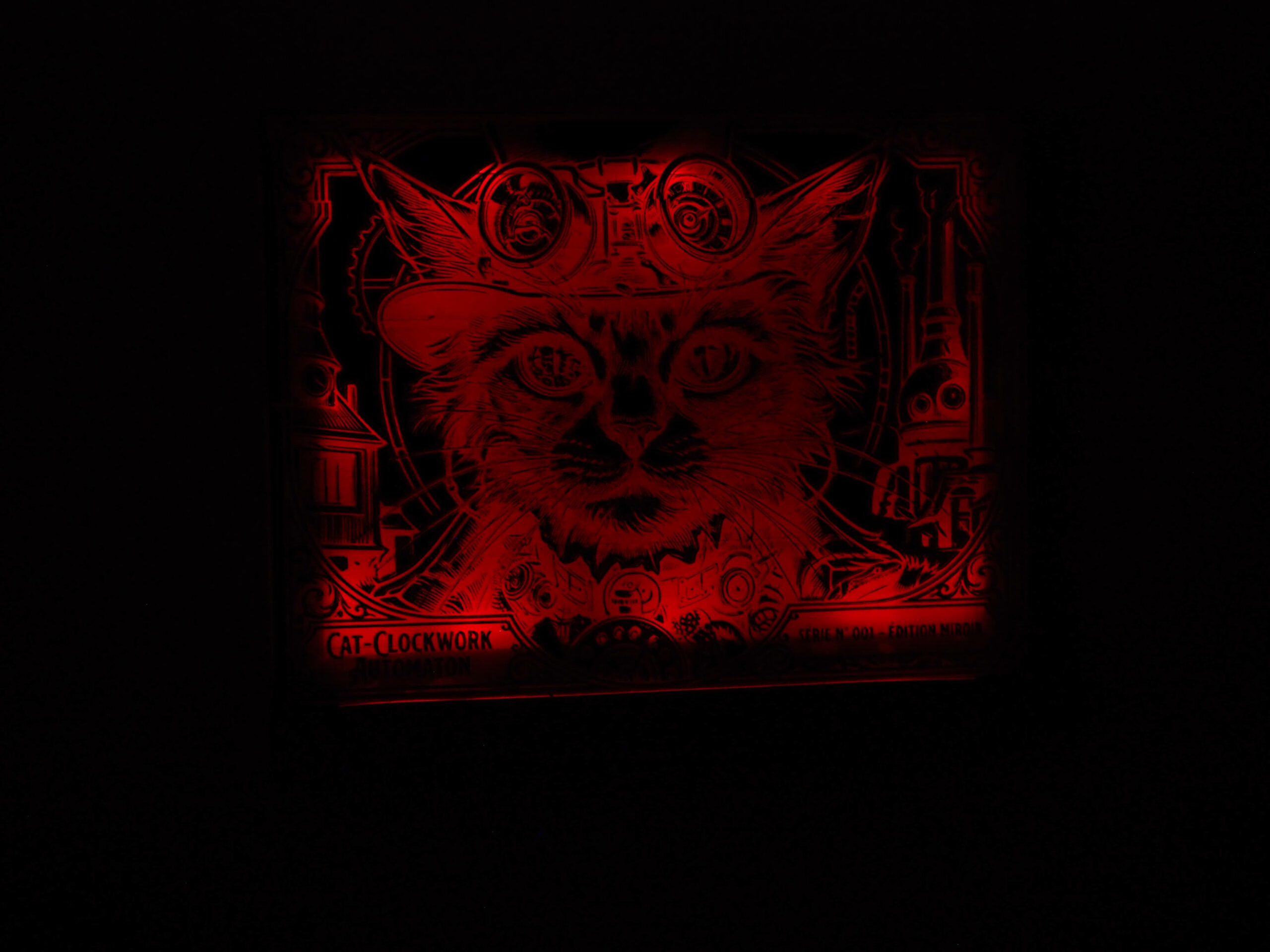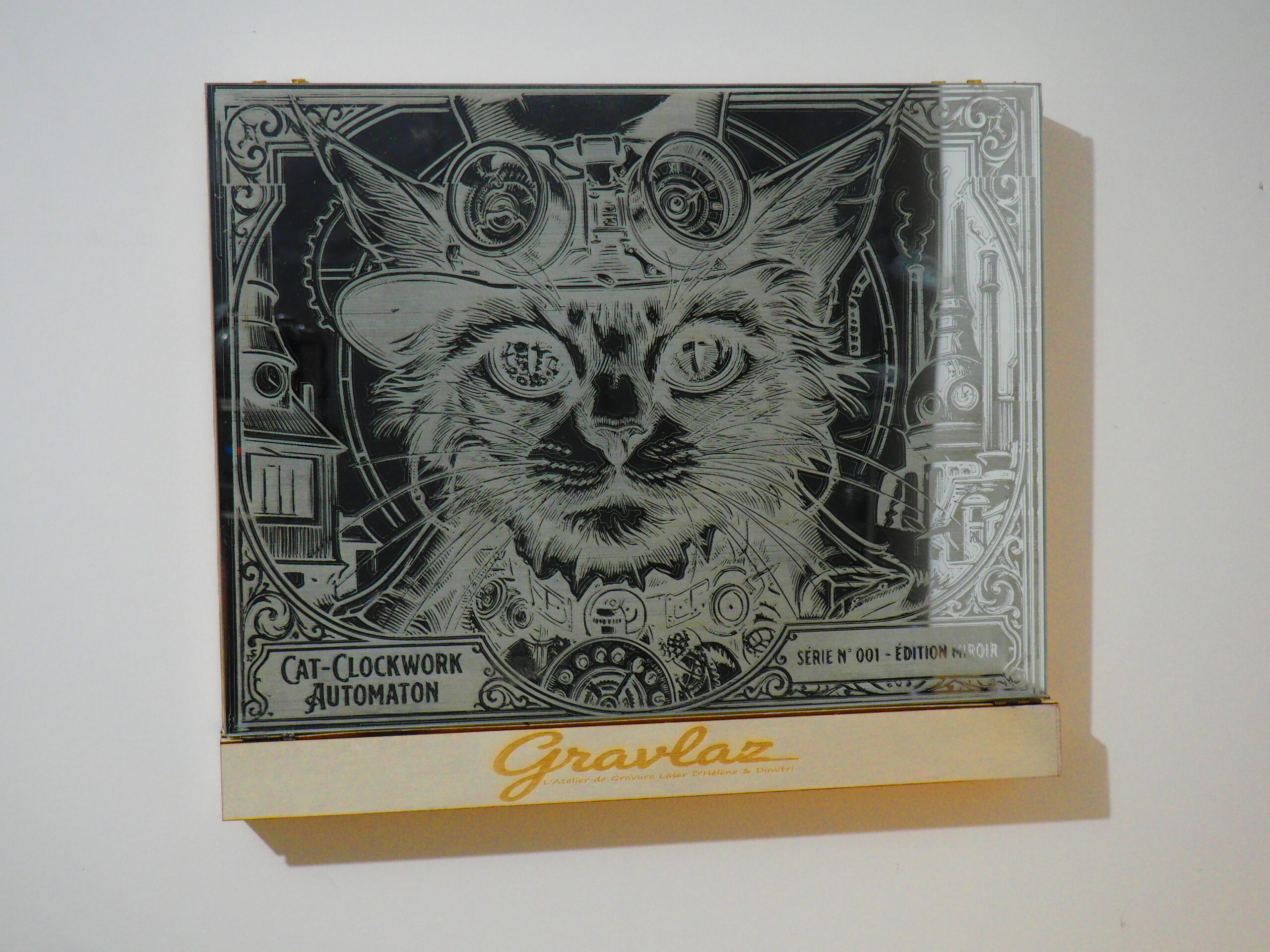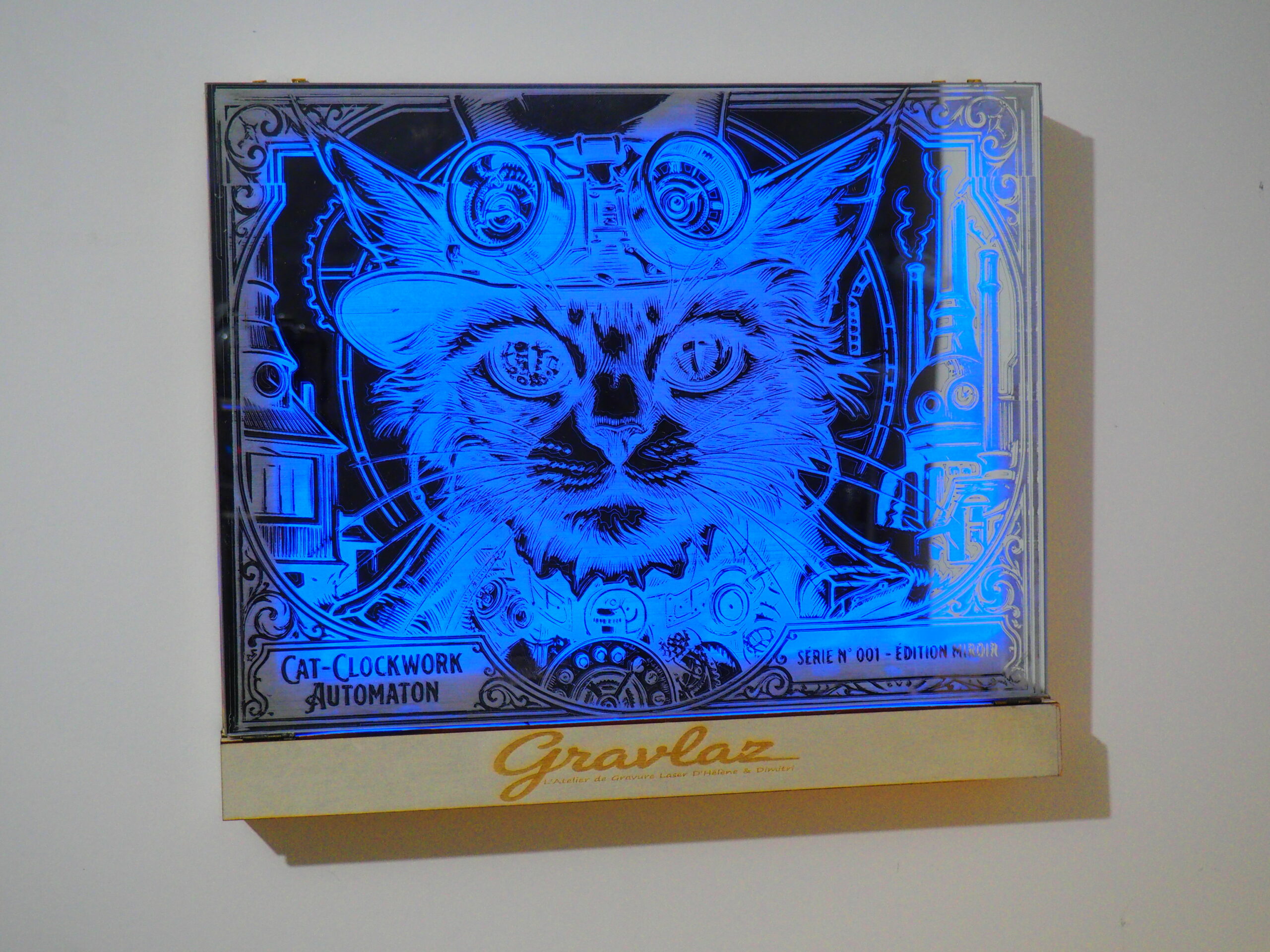 Au cœur de cette pièce, nous gravons avec une précision chirurgicale un chat-automate steampunk sur un miroir de haute qualité. Admirez le félin : ses goggles mécaniques et son collier de rouages minutieux s’éveillent sous l’effet du rétro-éclairage.