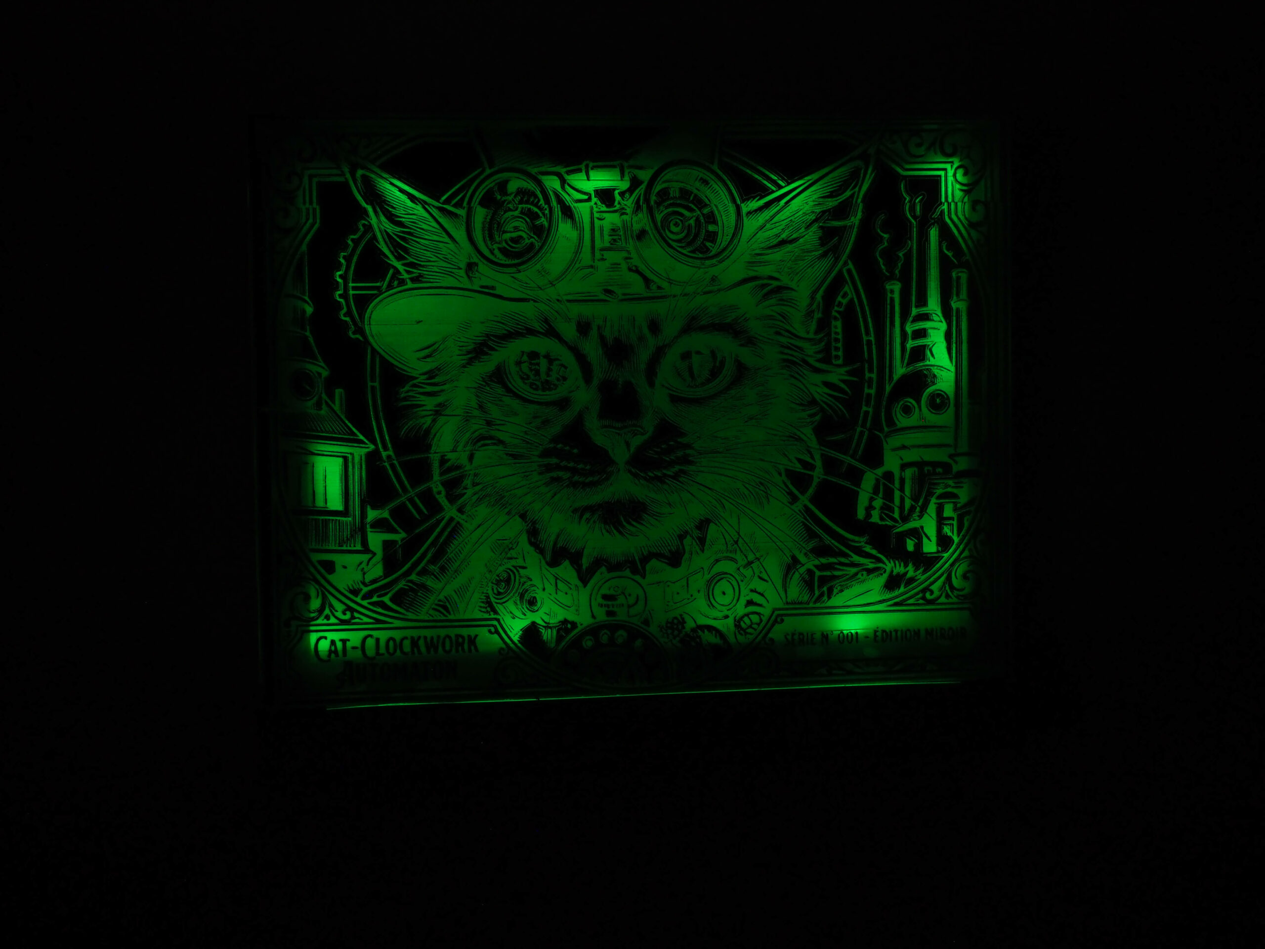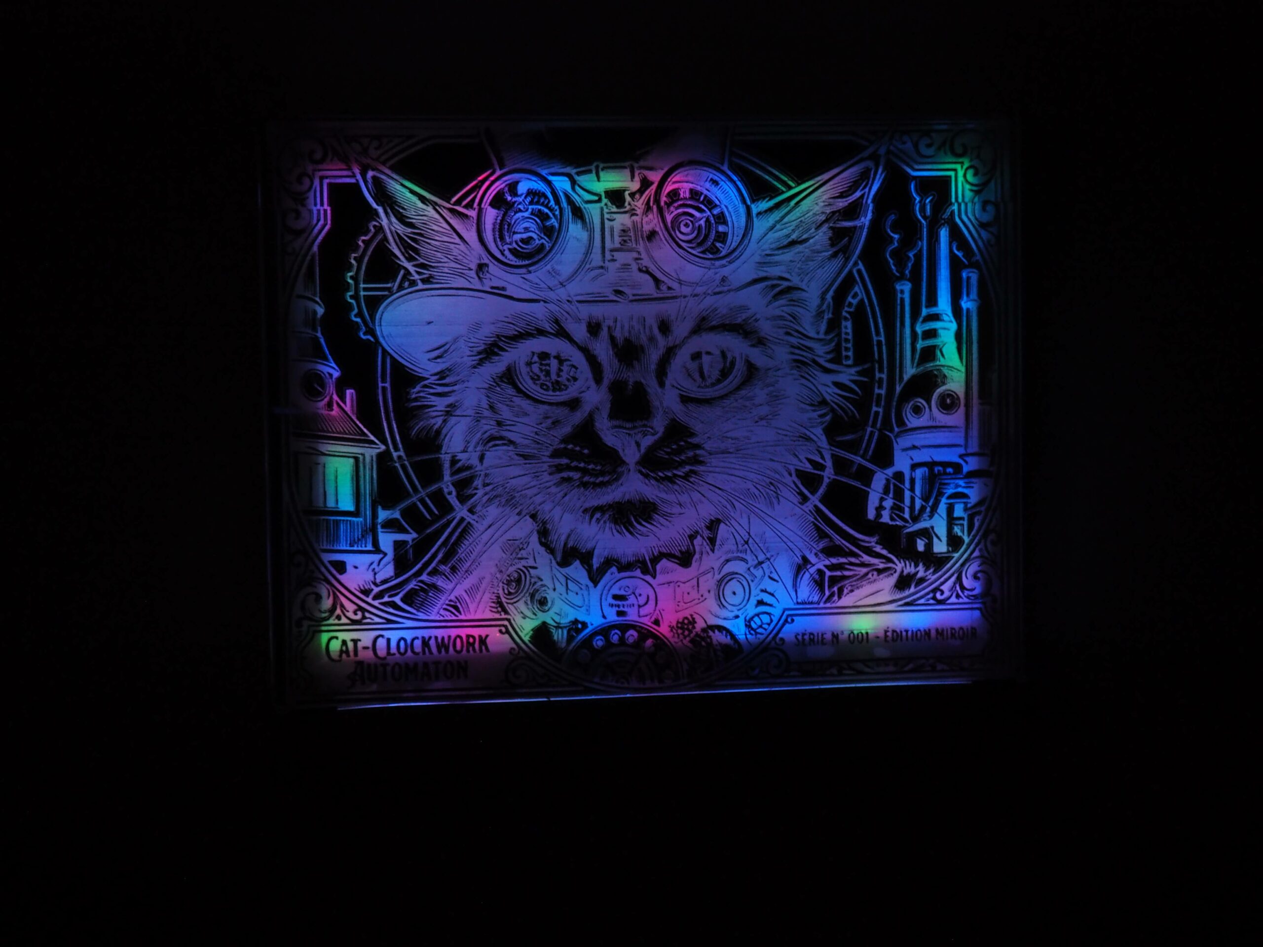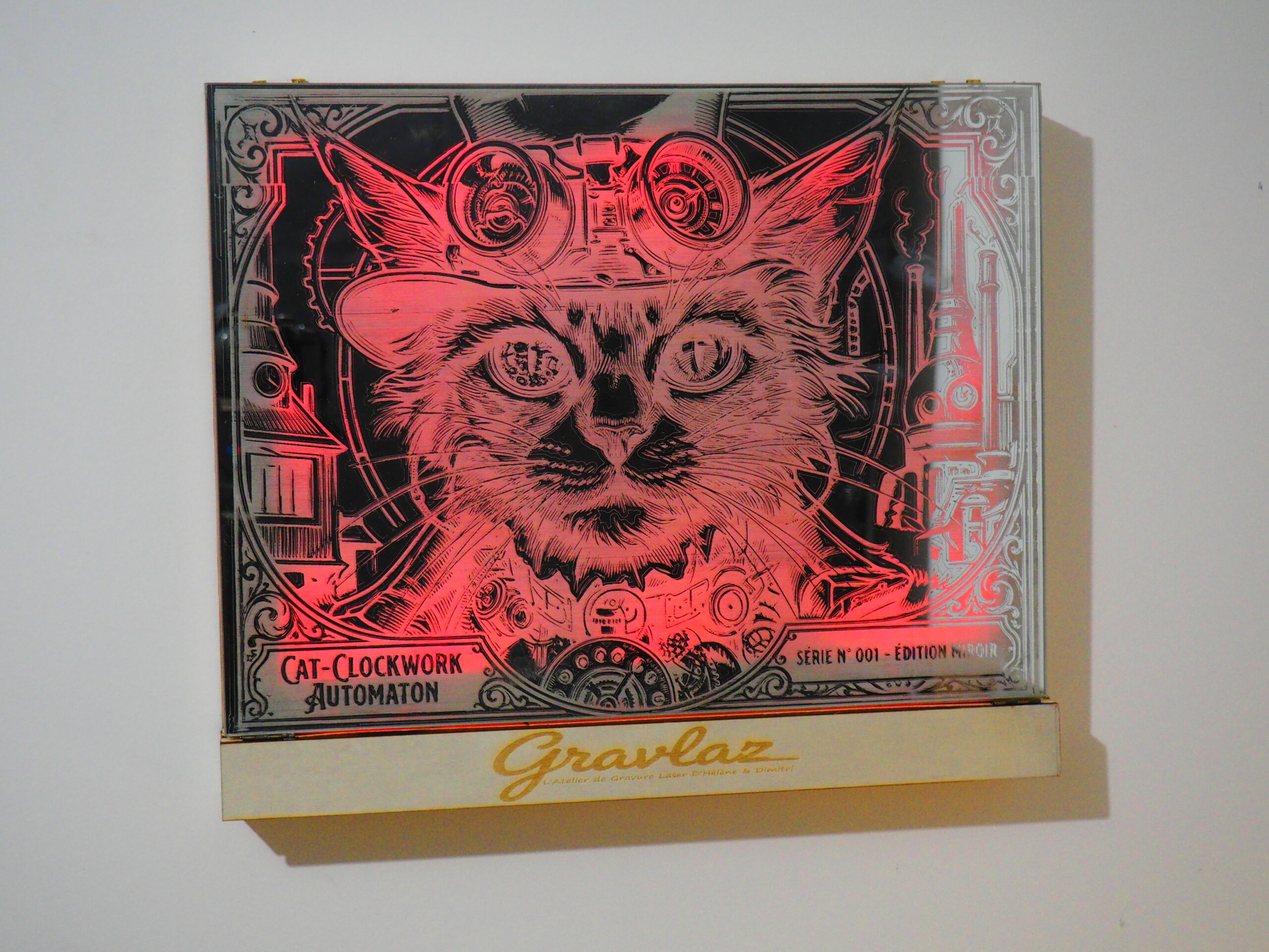 Au cœur de cette pièce, nous gravons avec une précision chirurgicale un chat-automate steampunk sur un miroir de haute qualité. Admirez le félin : ses goggles mécaniques et son collier de rouages minutieux s’éveillent sous l’effet du rétro-éclairage.